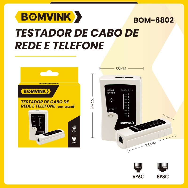 Testador de Cabo de Rede BOM-6802 é uma ferramenta prática e essencial para quem trabalha com instalações de redes de computadores. Ele permite verificar rapidamente se os cabos de Ethernet estão conectados corretamente, identificando problemas como fios trocados, conexões abertas ou curtas. Compacto e fácil de usar, esse testador ajuda a garantir que sua rede esteja funcionando de forma eficiente e sem falhas.